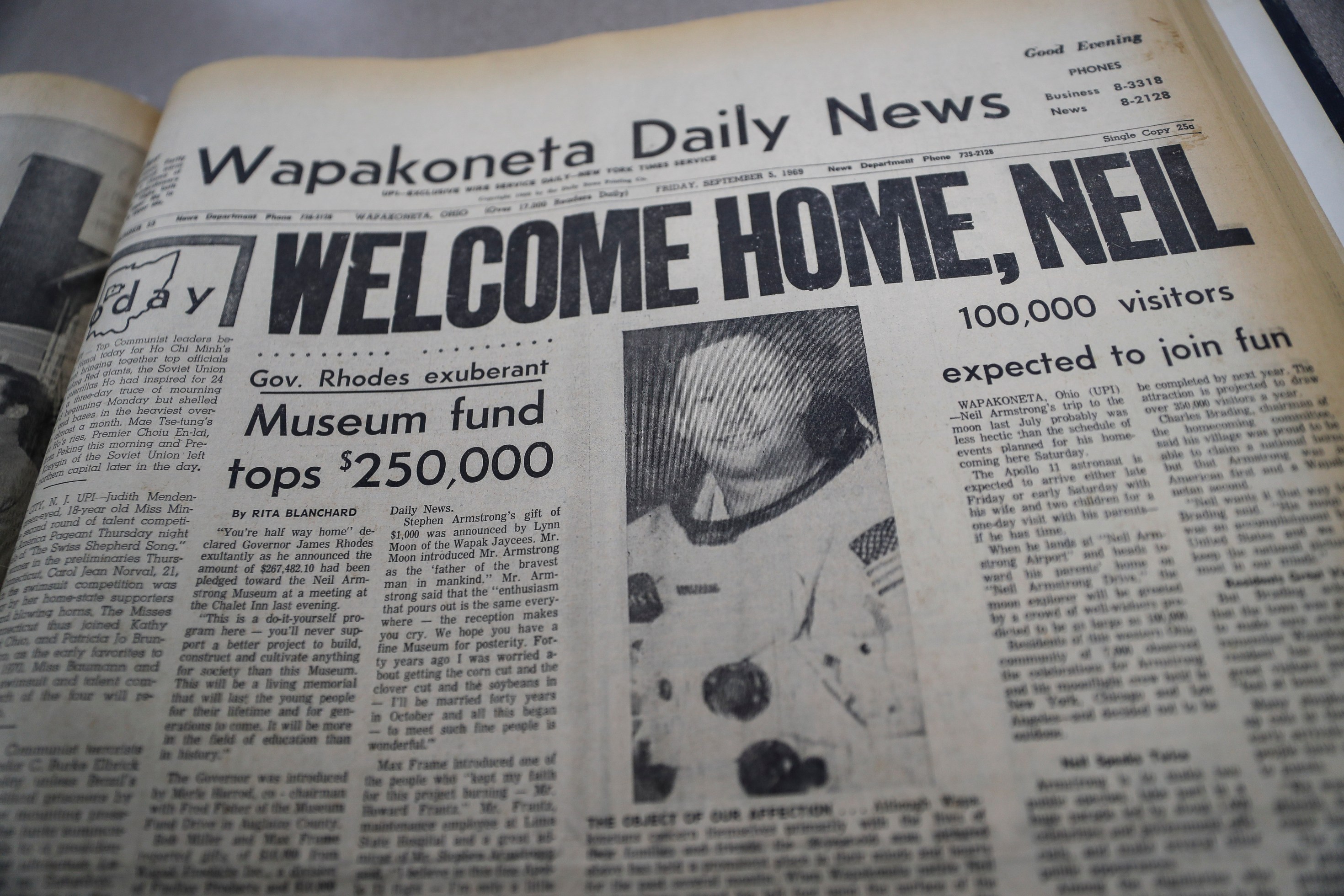 The front page of the Wapakoneta Daily News, dated Sept. 6, 1969, is photographed at the Auglaize County Public Library archives, Wednesday, June 26, 2019, in Wapakoneta, Ohio. Very down to earth about most things, folks in this small western Ohio city are over the moon as they get ready to celebrate the 50th anniversary of the day they watched their hometown hero along with the world. Neil Armstrong put Wapakoneta on the map in July 1969 when he became the first human to walk on the moon. (AP Photo/John Minchillo)