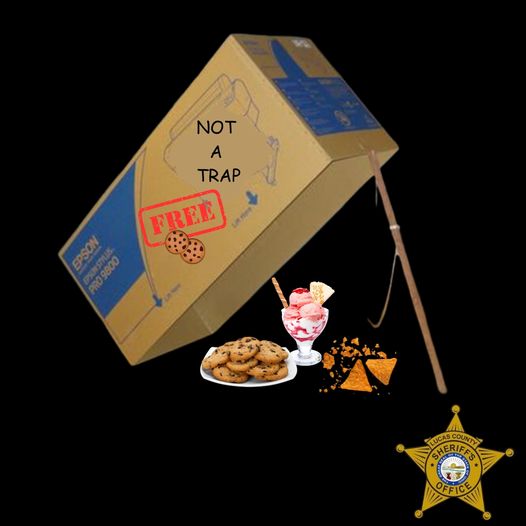 The post on the Lucas County Sheriff’s Office’s Facebook page displayed a picture of an empty printer paper box held up by a stick above a plate of chocolate chip cookies, an ice cream sundae and nacho cheese chips. On the empty box the word “free” is placed next to another picture of a chocolate chip cookie. Also written on the box is the phrase “not a trap.”