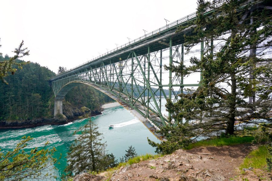 The Deception Pass Bridge, nearly 1,000-feet long and about 180-feet above the waters below, is covered in scaffolding as work to replace corroded steel and paint the structure continues Thursday, April 29, 2021, in Deception Pass, Wash. Raising state taxes to improve roads and bridges is one of the few things many Republican and Democratic lawmakers have agreed on in recent years. Those efforts have slowed to a crawl this year, even as lawmakers acknowledge a widening gap between needed work and the money to pay for it. (AP Photo/Elaine Thompson)
