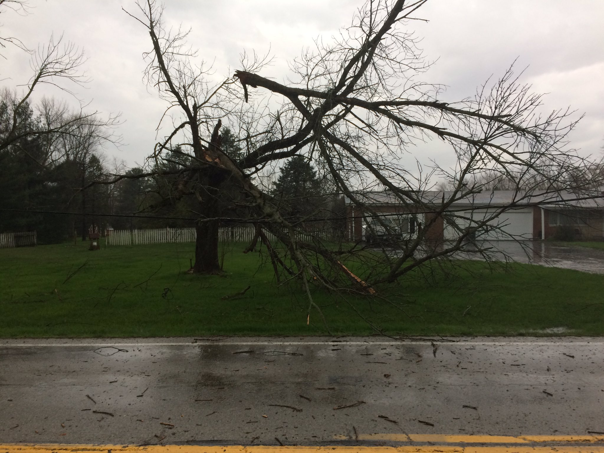 In New Lebanon, tree limbs were scattered on roadways. One large tree snapped in half and fell on power lines, putting people in the 800 block of Diamond Mill Road in the dark.