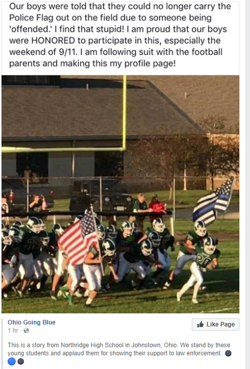 Many concerned parents began posting this picture to their Facebook page because of a rumor. It claimed the football team had to stop carrying this blue, black, and white police flag because someone was offended by it.