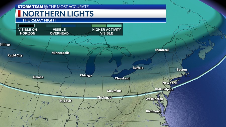 Thursday will see the next chances to see the aurora borealis or northern lights across much of the northern United States. Here in Ohio it will be possible to see them along the horizon. Moving closer to Lake Erie and beyond would increase the ability to see them overhead.