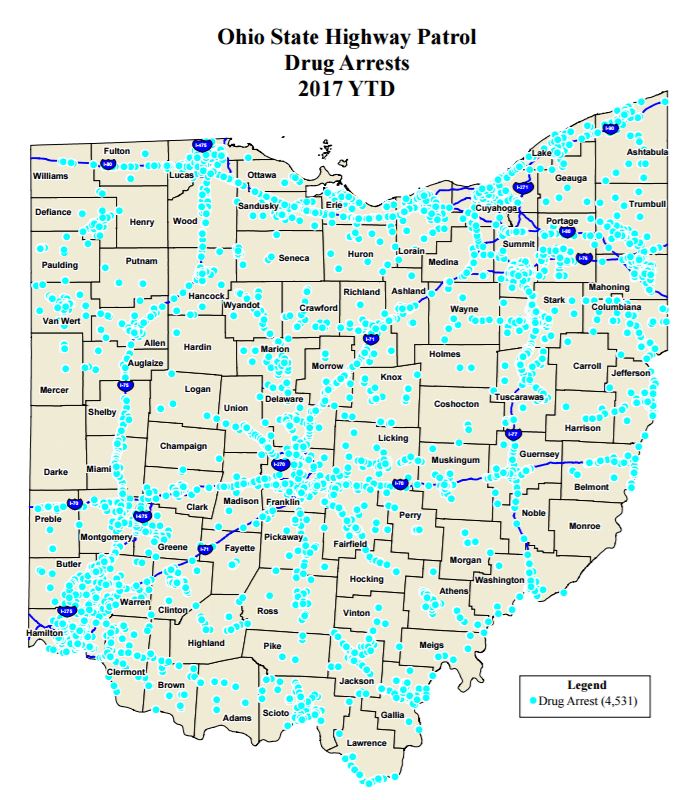 COLUMBUS (WCMH) — Troopers with the Ohio State Highway Patrol have made more than 4,500 drug arrests along roadways so far this year; about 400 more than this time in 2016.