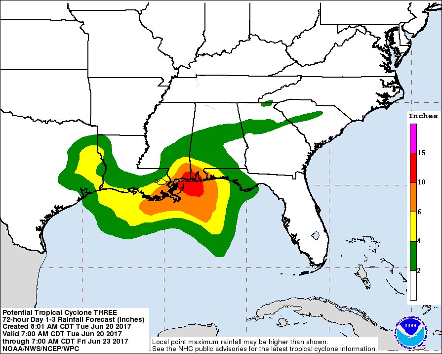 The main threat with this storm is flooding, with up to a foot of rain possible over southeastern Louisiana, southern Mississippi, southern Alabama and the Florida panhandle. Up to six inches of rain is possible over southwestern Louisiana and southeast Texas through Thursday.