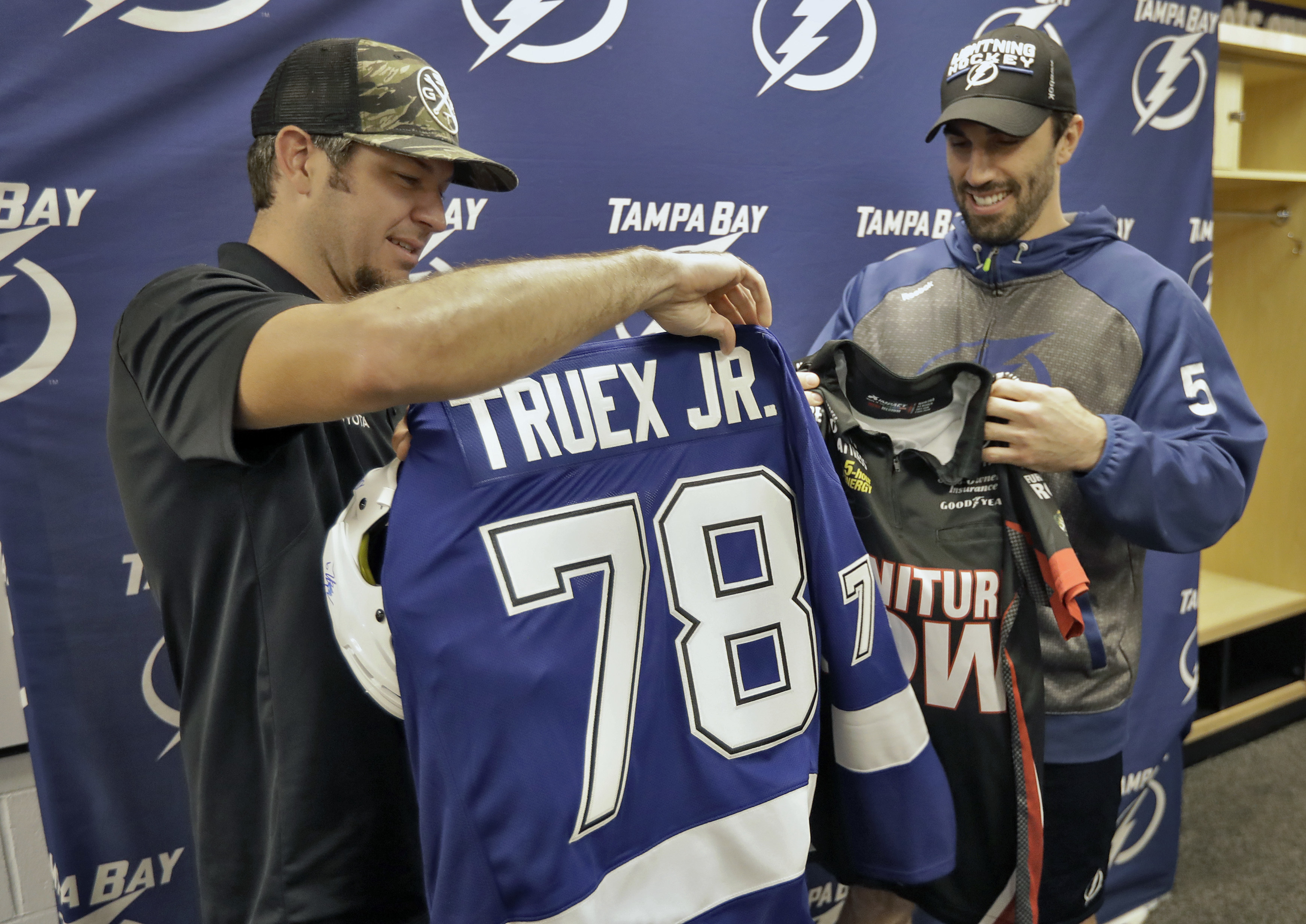 Truex was in attendance for Tuesday’s NHL game between the Los Angeles Kings and Tampa Bay. He traded helmets with Lightning defenseman Jason Garrison, and received a No. 78 – his car number – Tampa Bay jersey from the team.