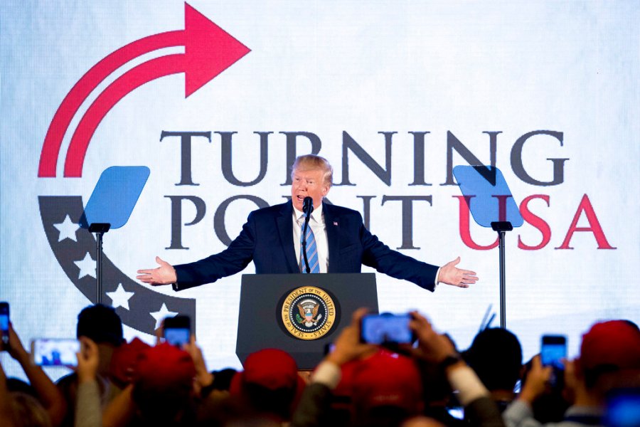 The president’s remarks drew cheers and chants of “four more years” from the crowd of mostly high school students attending a teen summit sponsored by Turning Point USA, which describes itself as a youth organization dedicated to educating and training and students “to promote the principles of freedom, free markets, and limited government.”