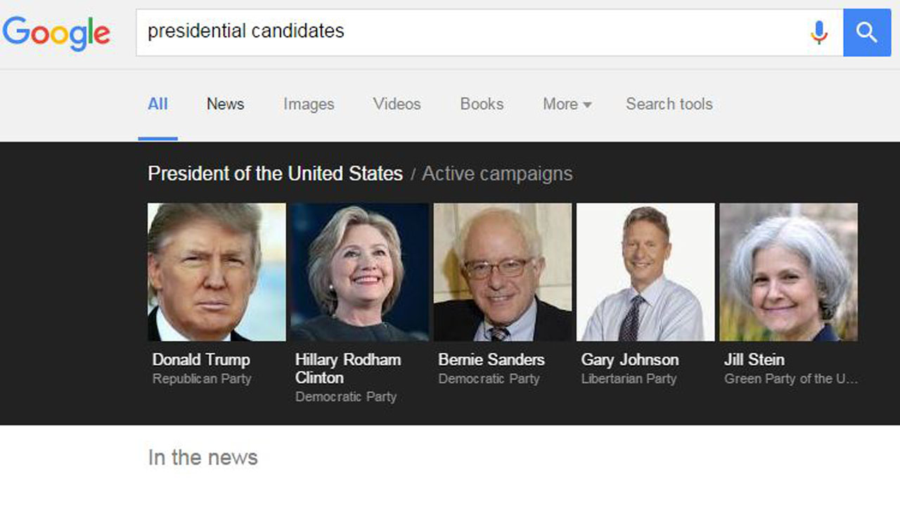 Searching for the term ‘presidential candidates’ brought up a handy guide above all of the other search results with pictures of candidates with active campaigns. Clicking on a picture brought up searches for the candidates.