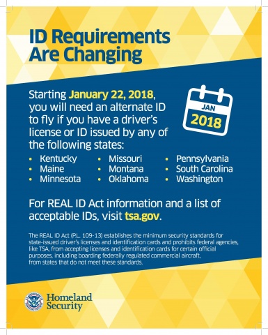 “ID requirements are changing,” signs going up at airports state. “Starting January 22, 2018, you will need a driver’s license or ID from a state compliant with the Real ID Act.”