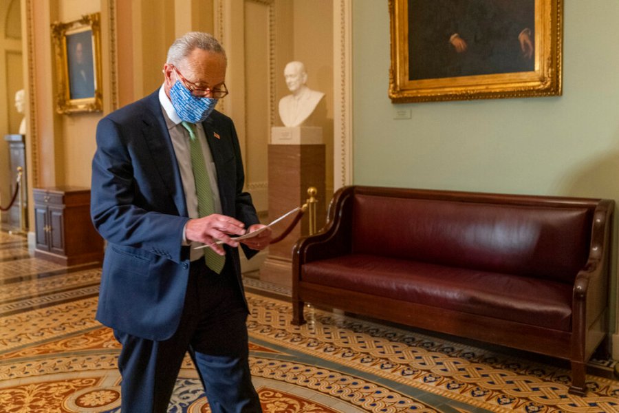 Senate Minority Leader Chuck Schumer of N.Y. walks outside the Senate floor on Capitol Hill, Thursday, Oct. 1, 2020, in Washington. (AP Photo/Manuel Balce Ceneta)