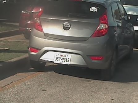 Miles might be driving a grey 2017 Hyundai Accent with Texas license plate number JGH9845. The vehicle has a hatchback with a white sticker on the upper right-hand corner of the rear window.