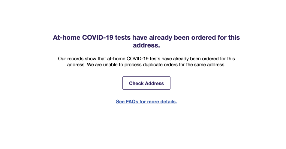 Some people who live in apartments, duplexes, co-ops or at other addresses that house multiple families ran into an error message Tuesday on the USPS site that reads: “At-home COVID-19 tests have already been ordered for this address.”