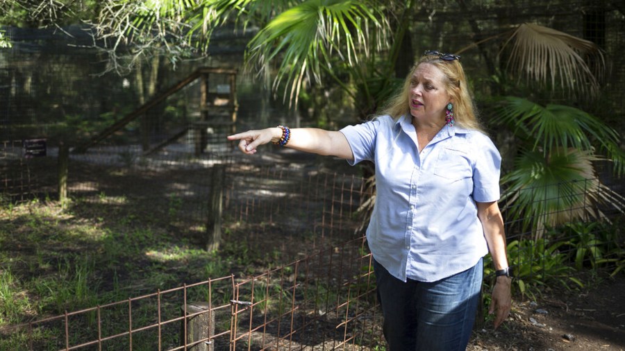 FILE - In this July 20, 2017 file photo, Carole Baskin, founder of Big Cat Rescue, walks the property near Tampa, Fla. Baskin was married to Jack “Don” Lewis, whose 1997 disappearance remains unsolved and is the subject of a new Netflix series “Tiger King.” (Loren Elliott/Tampa Bay Times via AP, File)