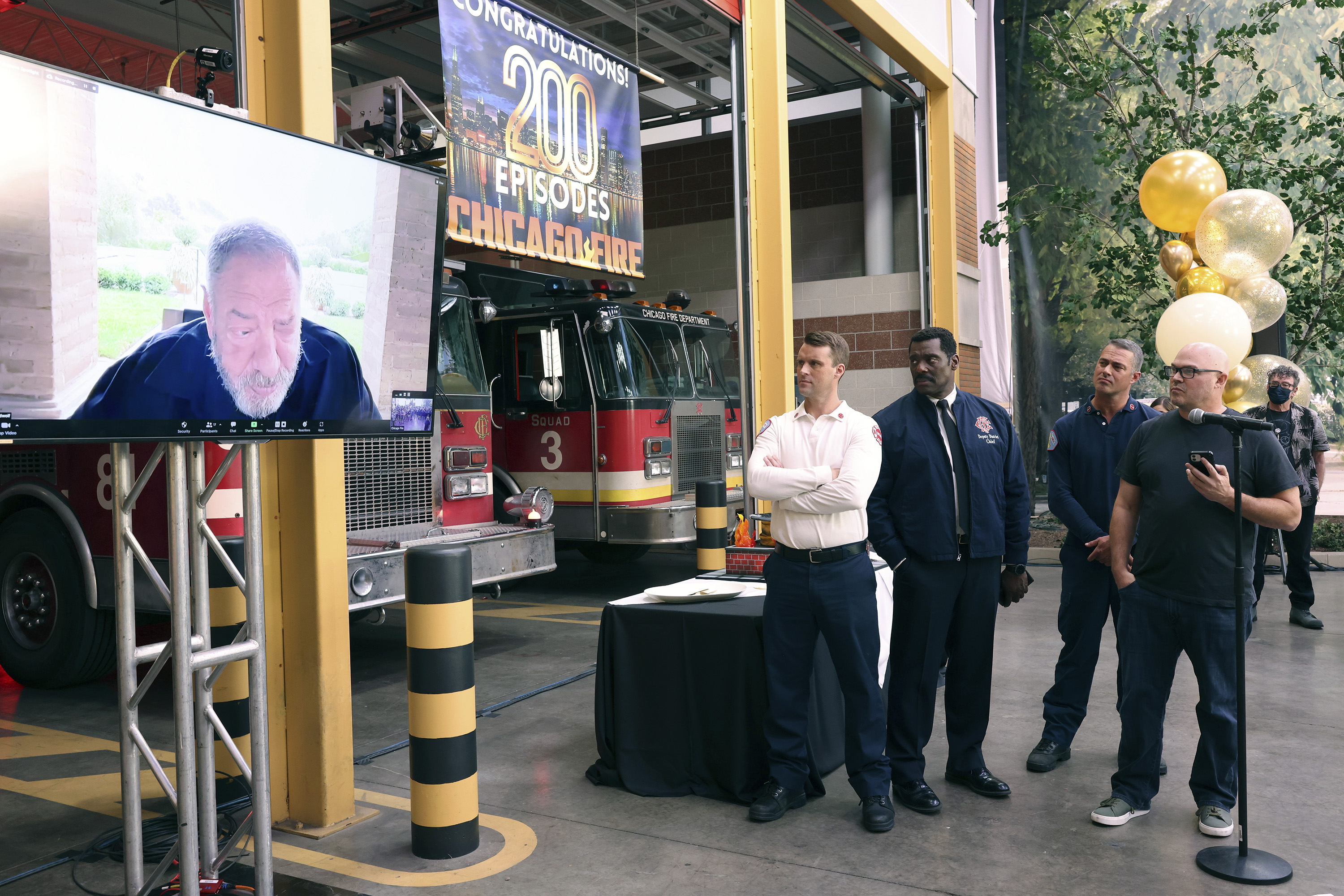 NBC revealed an on-set party marking the occasion — complete with a huge cake decorated with a helmet and a fire hose.