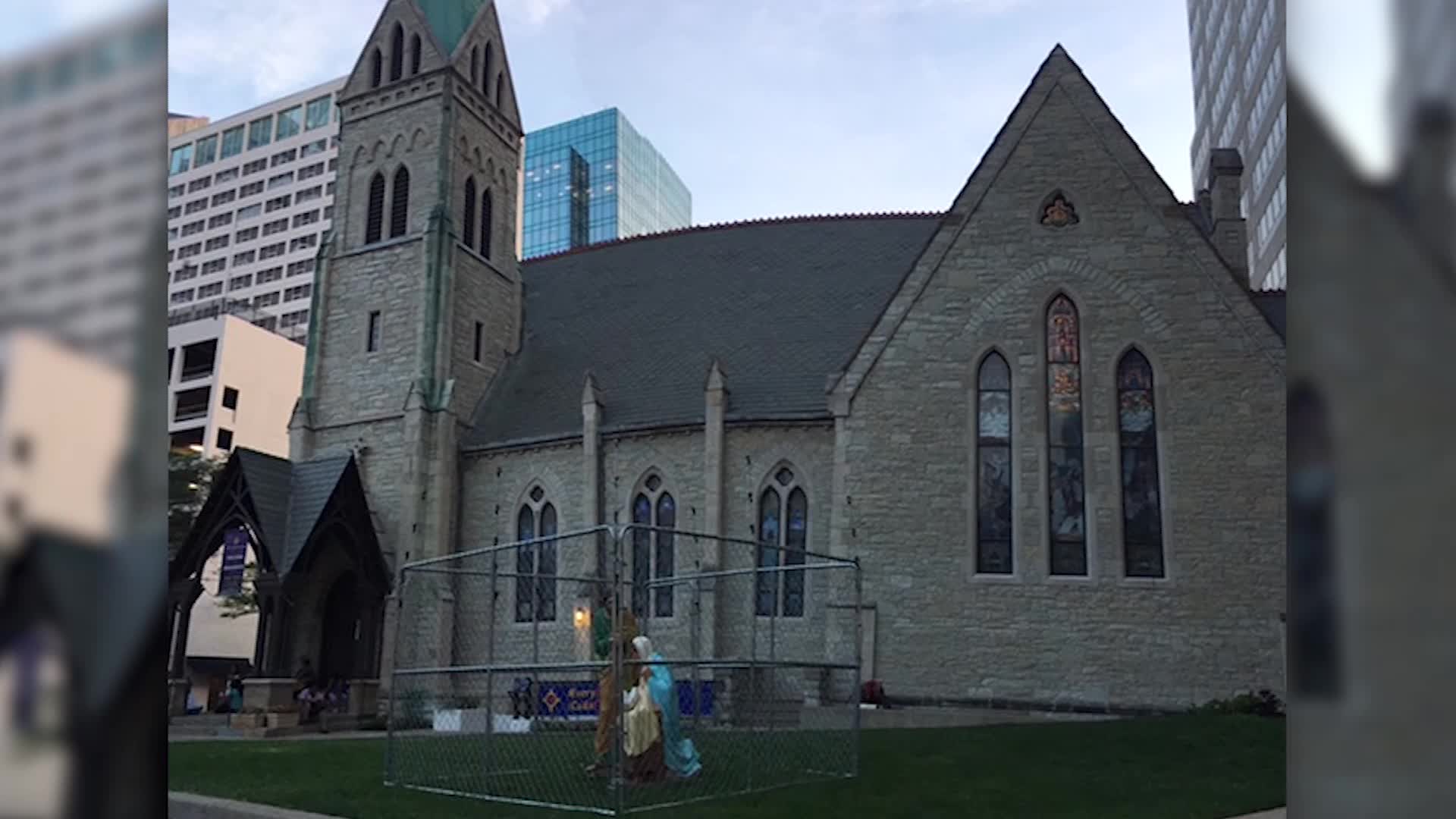Christ Cathedral on Monument Circle set up a display on its lawn. It shows a manger scene inside a chain link fence.