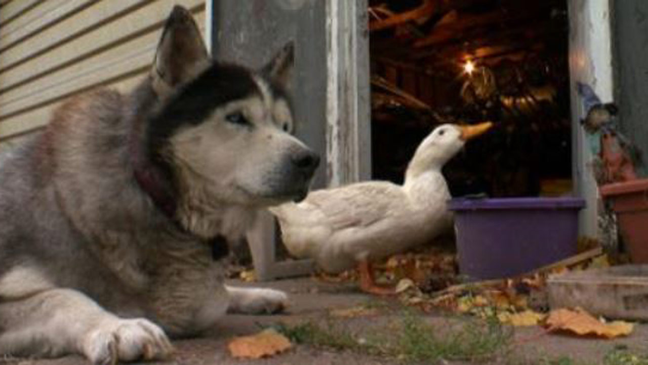 Meet Max, a 12-year-old Husky, and Quackers, a 4-year-old duck.