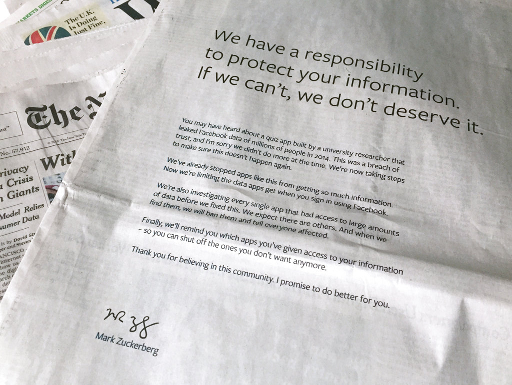 The ads signed by Mark Zuckerberg said a quiz app built by a Cambridge University researcher leaked Facebook data of millions of people four years ago. “This was a breach of trust, and I’m sorry we didn’t do more at the time. We’re now taking steps to make sure this doesn’t happen again,” the ads said.