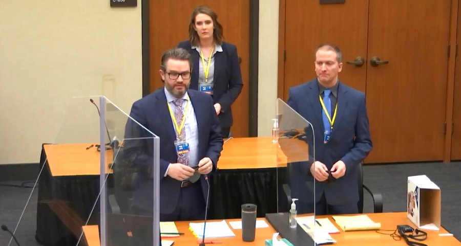 In this image taken from video, defense attorney Eric Nelson, left, defendant former Minneapolis police officer Derek Chauvin, right, and Nelson's assistant Amy Voss, back, introduce themselves to jurors as Hennepin County Judge Peter Cahill presides over jury selection in the trial of Chauvin, Monday, March 22, 2021, at the Hennepin County Courthouse in Minneapolis. Chauvin is charged in the May 25, 2020, death of George Floyd. (Court TV via AP, Pool)