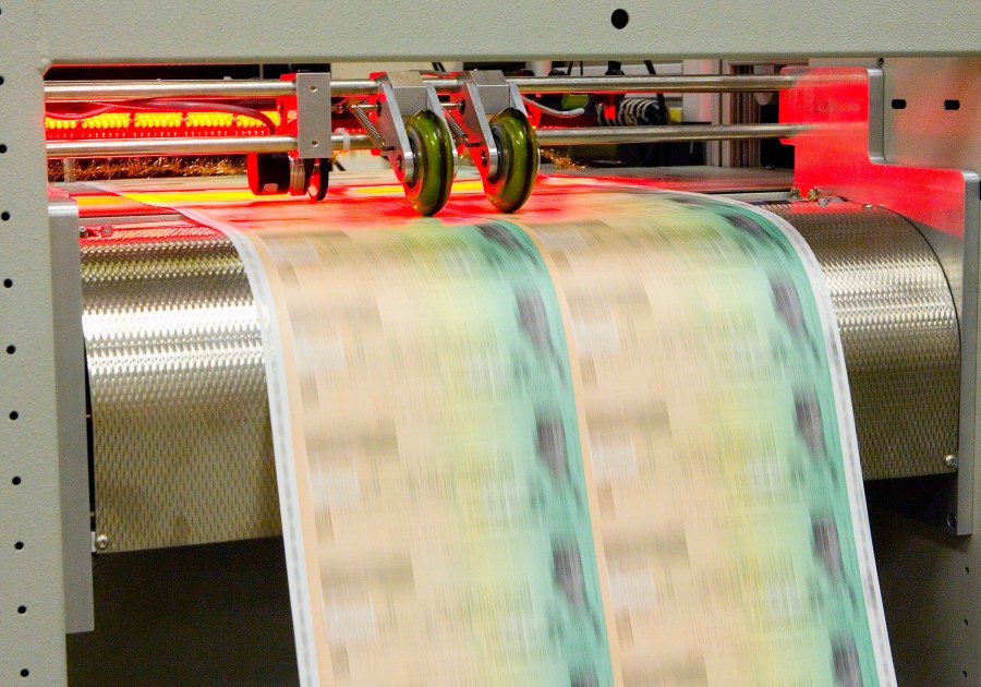 Economic stimulus checks are printed at the Philadelphia Financial Center May 8, 2008, in Philadelphia, Pennsylvania. (Photo by Jeff Fusco/Getty Images)