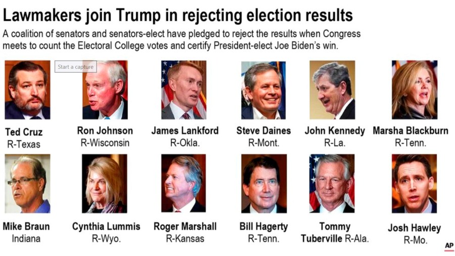 Cruz’s coalition of 11 Republican senators vows to reject the Electoral College tallies unless Congress launches a commission to immediately conduct an audit of the election results. They are zeroing in on the states where Trump has raised unfounded claims of voter fraud. Congress is unlikely to agree to their demand.