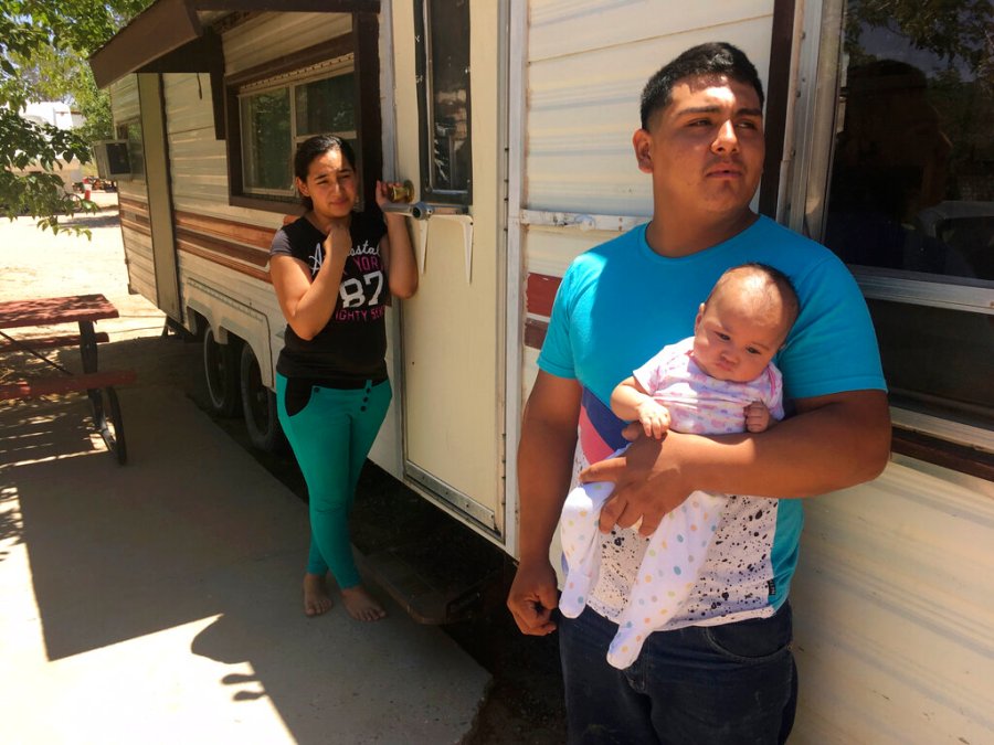 In this May 25, 2018 photo, Jose Espinoza, 18, stands out his trailer with his 4-month-old infant, Emmily, and wife, Maria Rodriguez, 19, in Vado, N.M. while speaking about making only $50 a day picking onions. The U.S. Census Bureau is using new high tech tools like aerial imagery to help get an accurate 2020 Census and avoid undercounting communities struggling with poverty. (AP Photo/Russell Contreras)