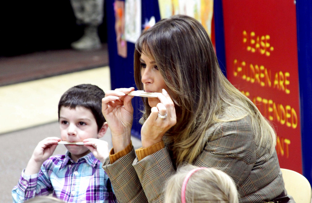 Melania Trump, wearing a three-quarter length winter coat over a brown turtle neck and white slacks, spent about 35 minutes visiting with children and teachers.