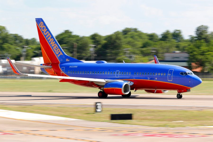 FILE - A Southwest Airlines jet takes off from Love Field in Dallas, Wednesday, June 24, 2020. (AP Photo/Tony Gutierrez)