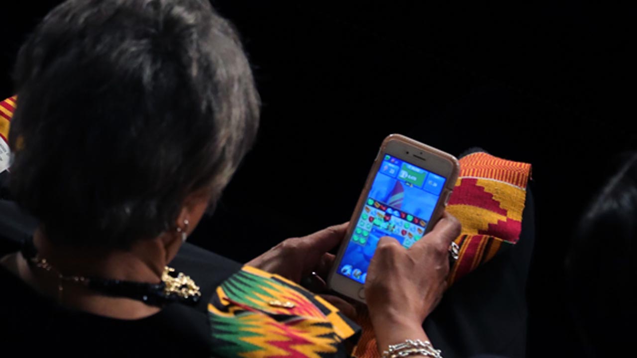 While Lawrence appears to be playing Candy Crush or one of its variants, Beatty appears to be going over a press release that was sent after the speech.