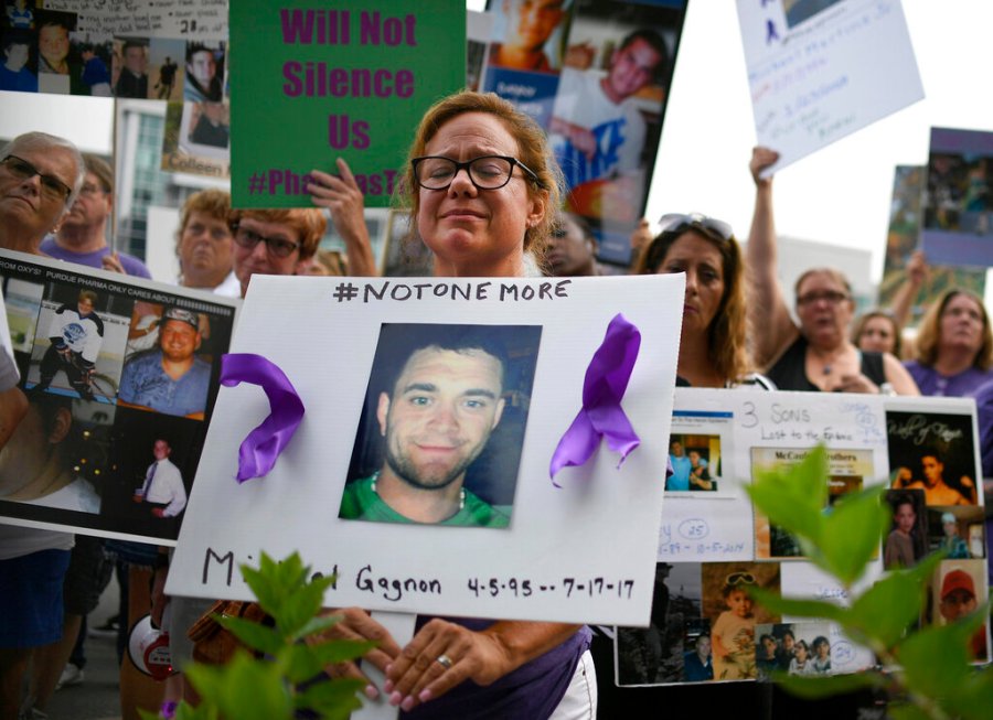 FILE - In this Aug. 17, 2018 file photo, Christine Gagnon, of Southington, Conn., holds a sign during a protest with others who have lost loved ones to OxyContin and opioid overdoses, outside the Purdue Pharma headquarters in Stamford, Conn. Gagnon lost her son Michael 13 months earlier. Nearly ten years ago, the blockbuster painkiller OxyContin was reformulated to discourage abuse by snorting and injecting, but it's unclear whether the harder-to-abuse format has decreased cases of addiction, overdose and death. (AP Photo/Jessica Hill, File)