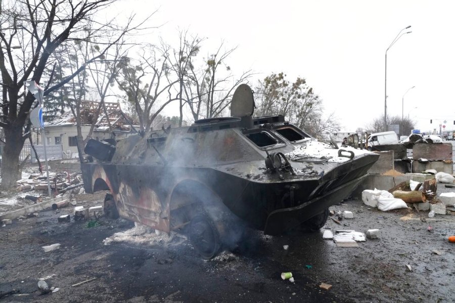 Smoke rises from a damaged armored vehicle at a checkpoint in Brovary, outside Kyiv, Ukraine, Tuesday, March 1, 2022. Russian shelling pounded civilian targets in Ukraine's second-largest city Tuesday and a 40-mile convoy of tanks and other vehicles threatened the capital — tactics Ukraine's embattled president said were designed to force him into concessions in Europe's largest ground war in generations. (AP Photo/Efrem Lukatsky)