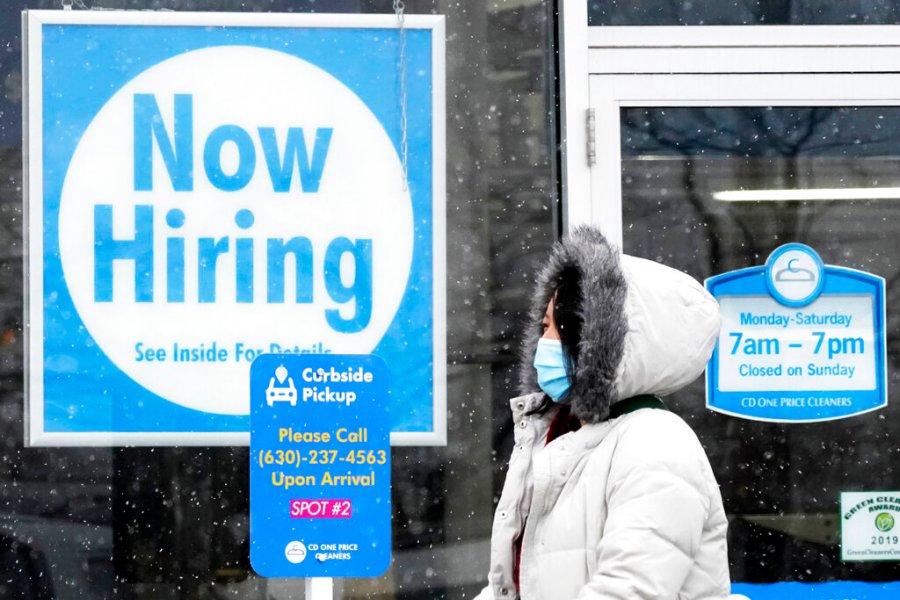 FILE - In this Feb. 6, 2021 file photo, a woman walks past a "Now Hiring" sign displayed at a CD One Price Cleaners in Schaumburg, Ill. In a stark sign of the economic inequality that has marked the pandemic recession and recovery, Americans as a whole are now earning the same amount of wages and salaries that they did before the pandemic struck, even with nearly 9 million fewer people at work. (AP Photo/Nam Y. Huh, File)
