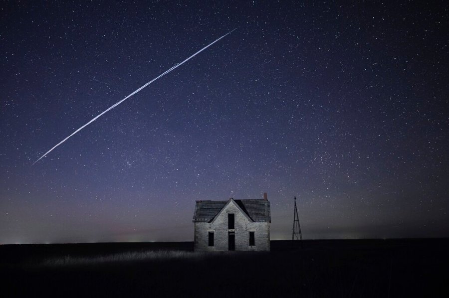 File-In this photo taken May 6, 2021, with a long exposure, a string of SpaceX StarLink satellites passes over an old stone house near Florence, Kan. The train of lights was actually a series of relatively low-flying satellites launched by Elon Musk's SpaceX as part of its Starlink internet service earlier this week. (AP Photo/Reed Hoffmann, File)