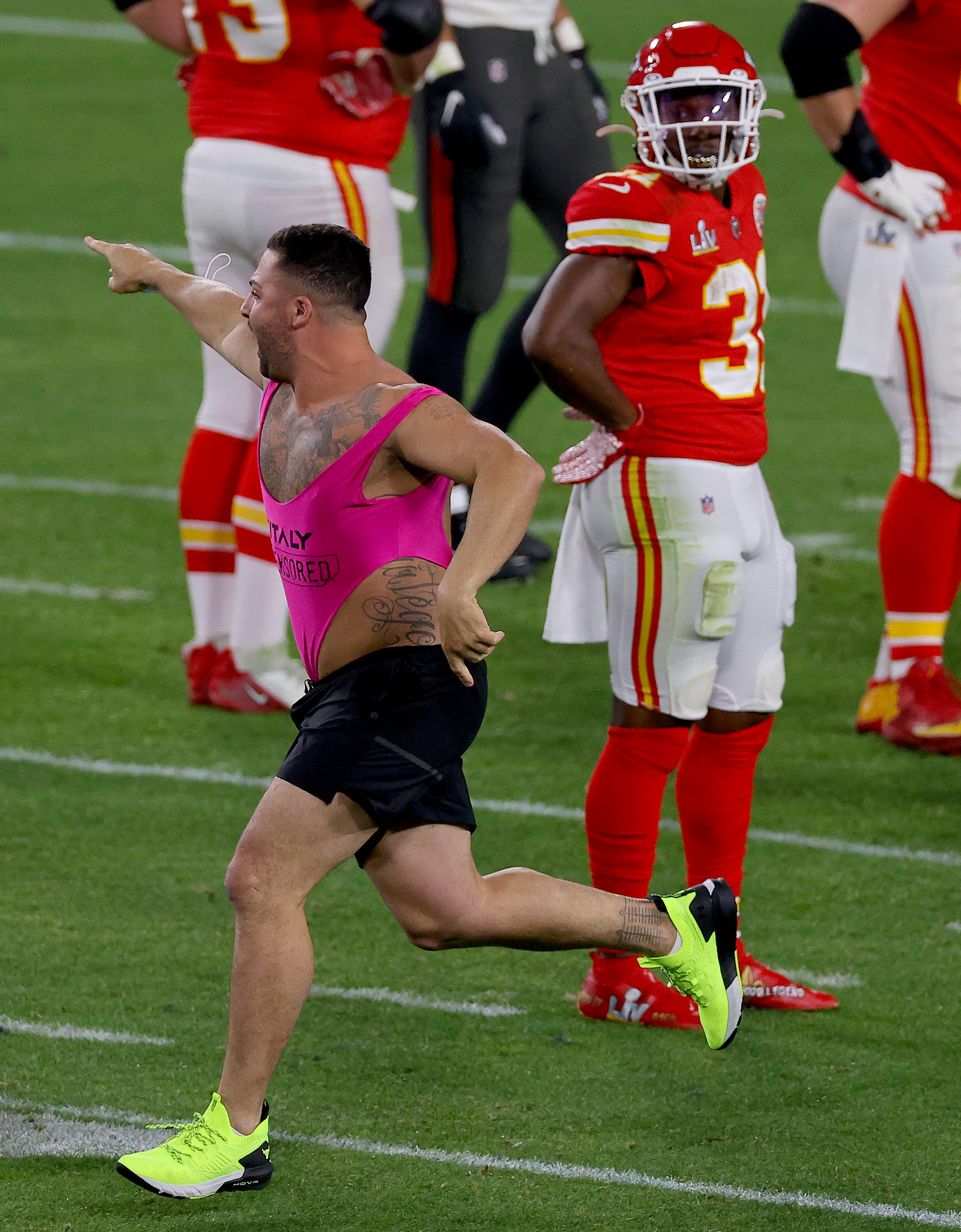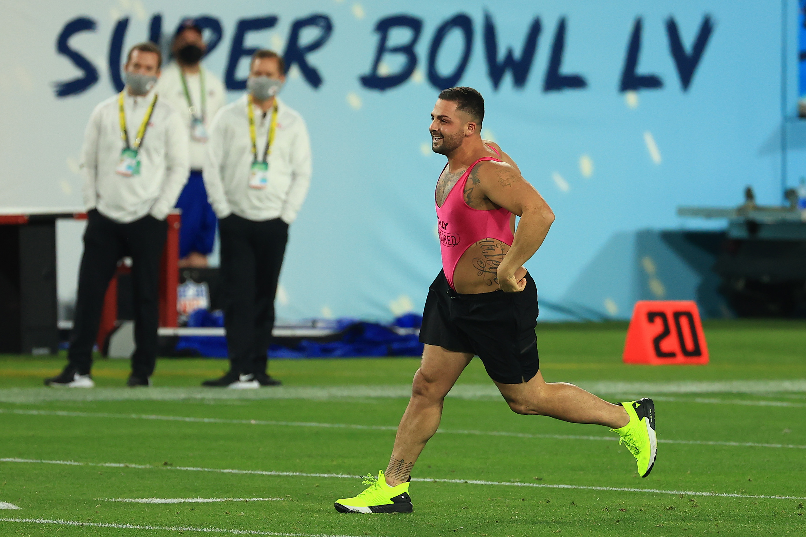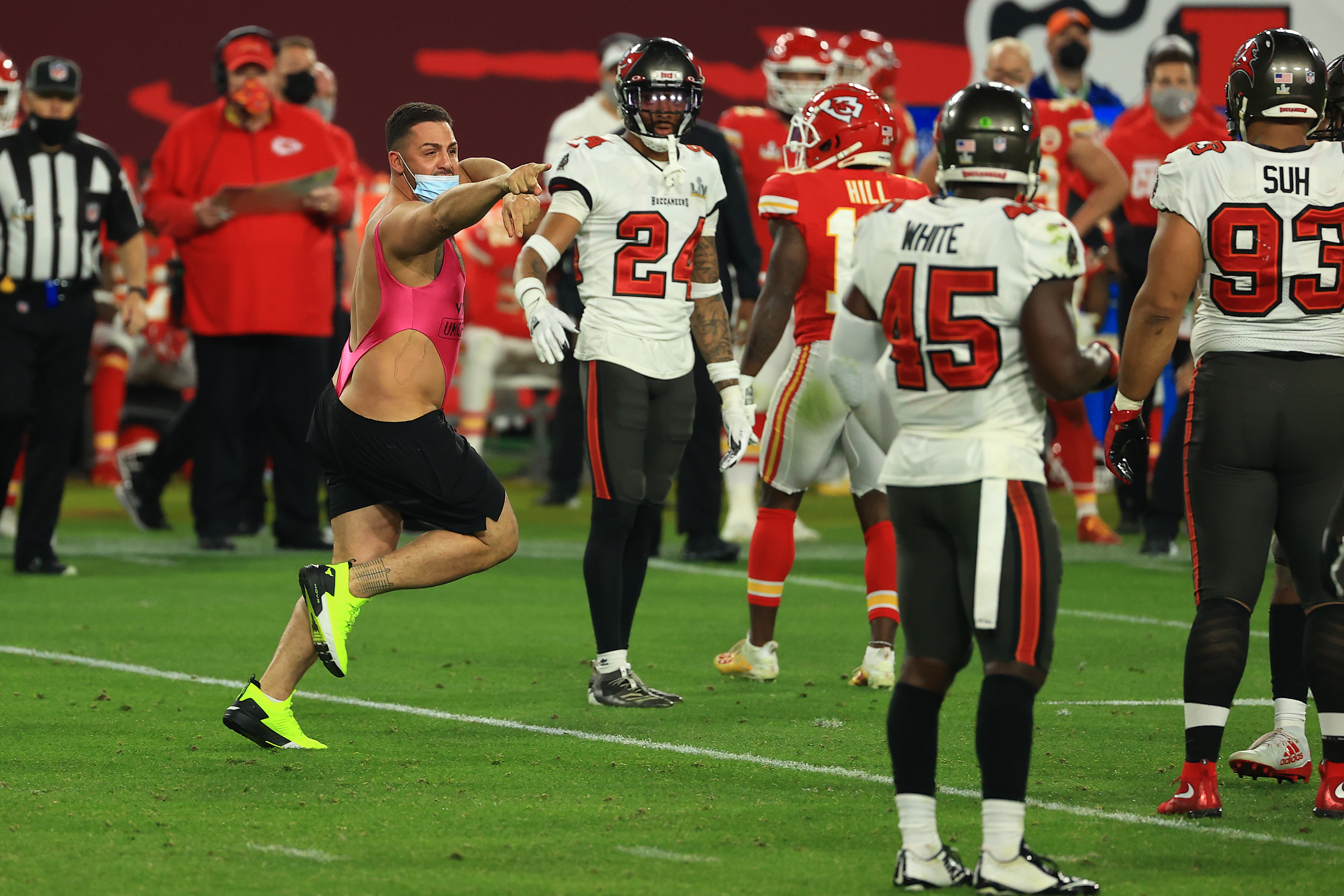 TAMPA, FLORIDA – FEBRUARY 07: A pitch invader takes the field during the fourth quarter in Super Bowl LV between the Tampa Bay Buccaneers and the Kansas City Chiefs at Raymond James Stadium on February 07, 2021 in Tampa, Florida. (Photo by Patrick Smith/Getty Images)