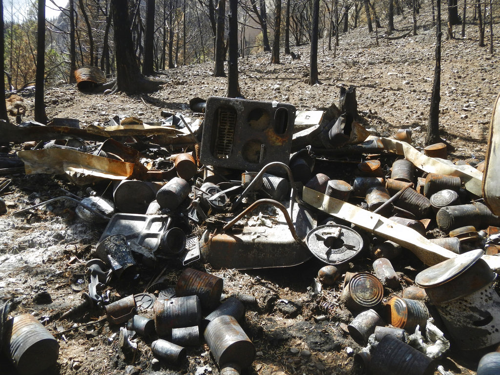 A small cabin untouched by the wildfire contained two bunk beds, food and water, reading material and other items, along with ammunition.