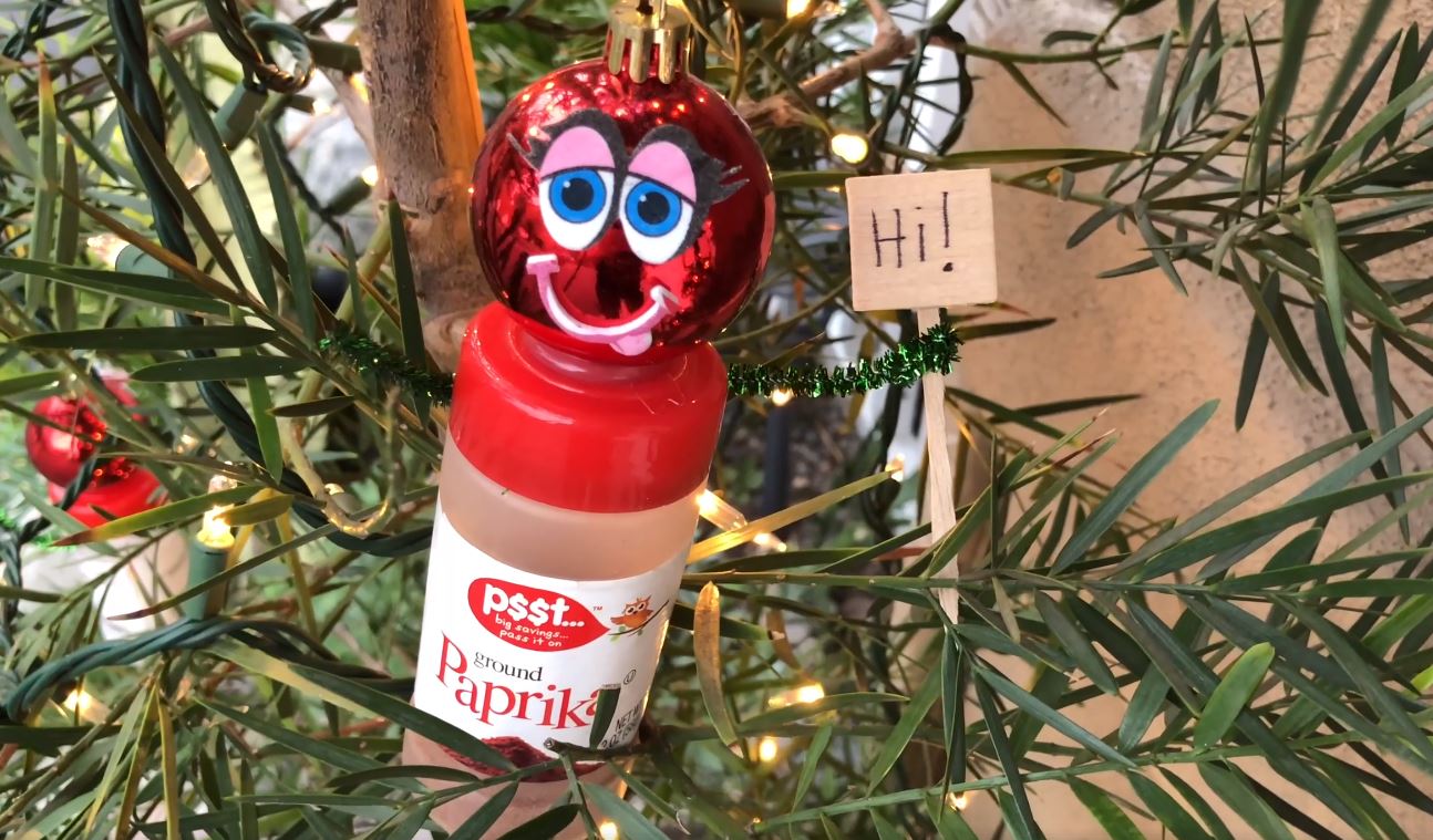Kyle says there are 10 puns, and Cori helped him “weed out” some others, including the idea to decorate with a goat on a mountain whose tail was on fire (Goat tail lit on the mountain = “Go Tell It On The Mountain”) and photos of actor Chris Pine on some cones for “Pine cones.”