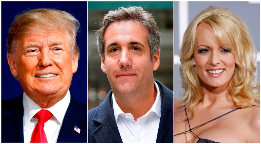 FILE - This combination of file photo shows, from left, President Donald Trump, attorney Michael Cohen and adult film actress Stormy Daniels. Search warrants unsealed Thursday, July 18, 2019, shed new light on the president's role as his campaign scrambled to respond to media inquiries about hush money paid to two women who said they had affairs with him. The investigation involved payments Cohen helped orchestrate to Daniels and Playboy centerfold Karen McDougal. (AP Photo/File)