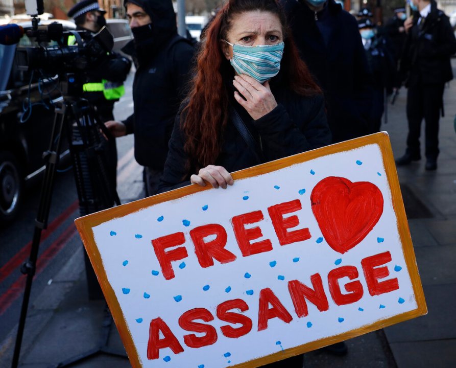 Several dozen Assange supporters gathered outside London’s Westminster Magistrates’ Court, shouting “Free Assange.” Police said seven people were arrested for breaching coronavirus lockdown rules.