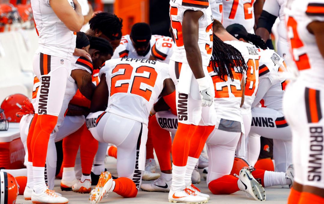 Linebackers Jamie Collins and Christian Kirksey, running backs Isaiah Crowell, Duke Johnson, Terrance Magee and Brandon Wilds, safety Jabrill Peppers, DeValve, wide receivers Kenny Britt and Ricardo Louis and defensive back Calvin Pryor dropped to one knee in a huddle. Rookie quarterback DeShone Kizer, offensive tackle Shon Coleman, punter Britton Colquitt, defensive back Jason McCourty and offensive lineman Marcus Martin stood and supported their teammates by putting their hands on their shoulders.