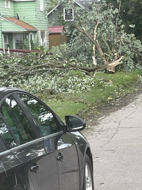 The NWS said the tornado caused significant damage near Detroit and Main streets, knocking down several trees and damaging the roofs of several homes and garages. A garage on Letson Street was completely destroyed.