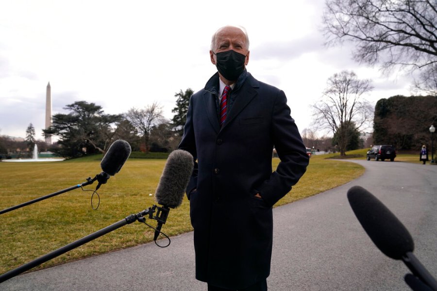 President Joe Biden speaks with reporters before boarding Marine One, Friday, Jan. 29, 2021, in Washington. Biden is traveling to Walter Reed National Military Medical Center. (AP Photo/Evan Vucci)