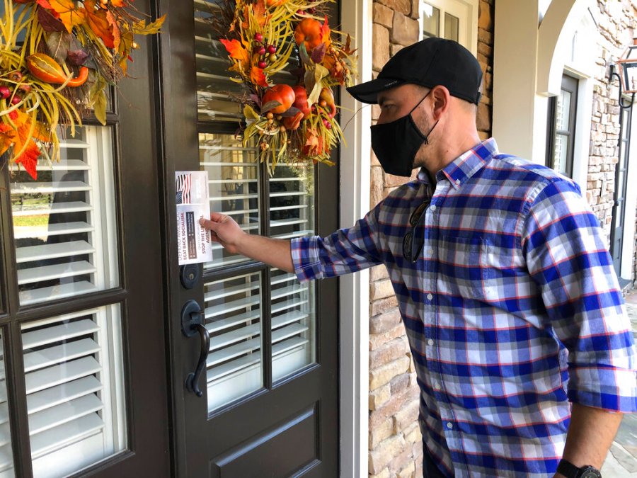 MILTON, Ga. (AP) — In a black face mask and cap, activist Garrett Bess walked up driveway after driveway of million-dollar homes in suburban Atlanta on a recent afternoon, placing a flyer in each door, ringing the bell and stepping away to make a socially distanced pitch to vote for the conservative candidates in Georgia’s pivotal U.S. Senate runoff elections.
