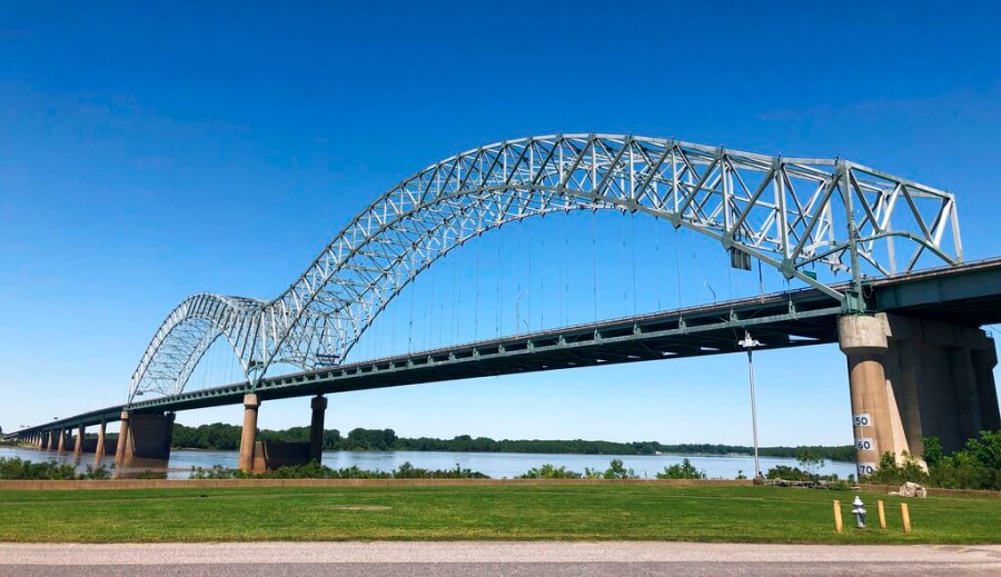FILE - This Friday, May 14, 2021 file photo shows the Interstate 40 Bridge linking Tennessee and Arkansas in Memphis, Tenn. U.S. Transportation Secretary Pete Buttigieg will visit the Interstate 40 bridge connecting Tennessee and Arkansas that's been indefinitely closed after a crack was found in one of its steel beams. The U.S. Department of Transportation on Friday, May 28, 2021 announced that Buttigieg will visit Memphis on June 3 to see the bridge spanning the Mississippi River.(AP Photo/Adrian Sainz, File)