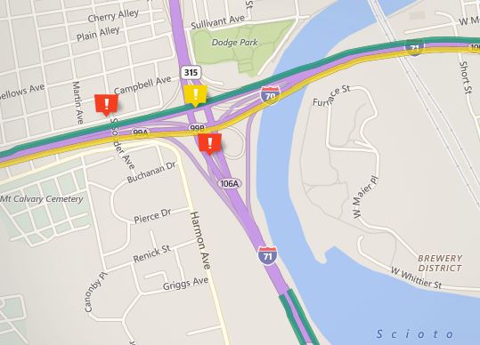 Crews had the ramps from I-71 north to I-70 east, and from State Route 315 south to I-70 east closed for about three hours Sunday while a semi truck was on its side.