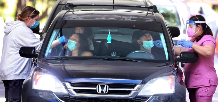 An Orange County family gets tested at the Econ Soccer Complex on the first day of the new COVID-19 drive-thru testing site hosted by Orange County Health Services at the park off East Colonial Drive, in Orlando, Fla., Monday, Dec. 27, 2021. At its peak, a line of cars was backed up several miles as thousands of Orange County residents sought testing during the current spike of infections across Central Florida from the omicron variant of the coronavirus. (Joe Burbank/Orlando Sentinel via AP)