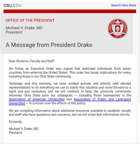 On Friday, an Executive Order was signed that restricted individuals from seven countries from entering the United States. This order has broad implications for many, including those in our Ohio State community.