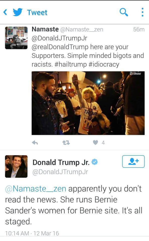 Last Saturday Trump, Jr. retweeted a composite photo identifying Portia Boulger as the woman giving the Nazi salute at last week’s cancelled Chicago appearance of Republican Presidential Front-runner Donald Trump. But Boulger wasn’t there.