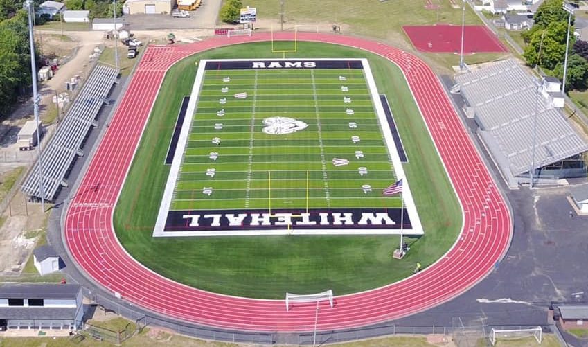The ad does not identify Whitehall’s stadium as the location, and the camera’s focus partially blurs the white “WHITEHALL” on black paint in the end zone. But an eye familiar with the field design and landmarks around the stadium can deduce where Gibbons is.