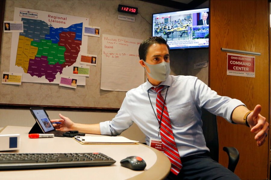 FILE - In this Nov. 3, 2020 file photo, Ohio Secretary of State Frank LaRose talks with staff members at Ohio's election command center, in Columbus, Ohio. LaRose launched his reelection bid on Monday, May 17, 2021, touting the state's smooth 2020 election even as many fellow Republicans expressed unfounded doubts in the presidential result and GOP lawmakers are backing a major rewrite to state voting laws. (AP Photo/Jay LaPrete, File)
