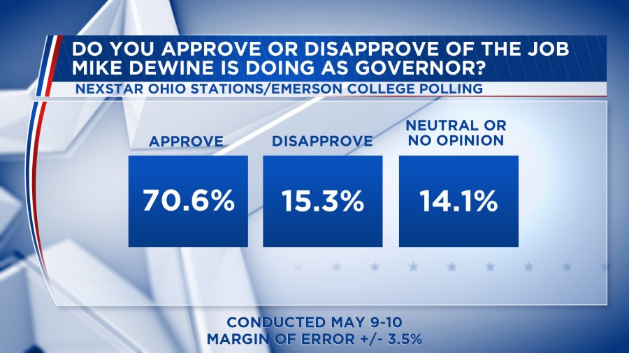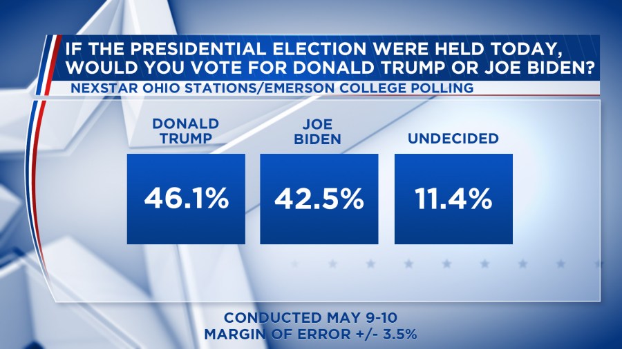 The May Ohio Emerson/Nexstar poll was conducted May 9-10, 2020. The margin of error in the Ohio poll is +/- 3.5 percentage points.