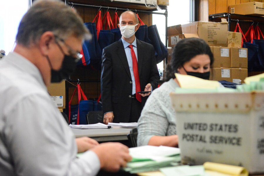FILE - In this Nov. 10, 2020, file photo, Republican poll watcher Douglas Bucklin, center, observes as Schuylkill County Election Bureau Director Albert L. Gricoski, left, and staffer Christine Marmas, right, open provisional ballots in Pottsville, Pa. Even after he exits the White House, President Donald Trump's scorched-earth strategy of challenging the legitimacy of elections and seeking to overturn the will of the voters by any means necessary could have staying power. (Lindsey Shuey/Republican-Herald via AP, File)