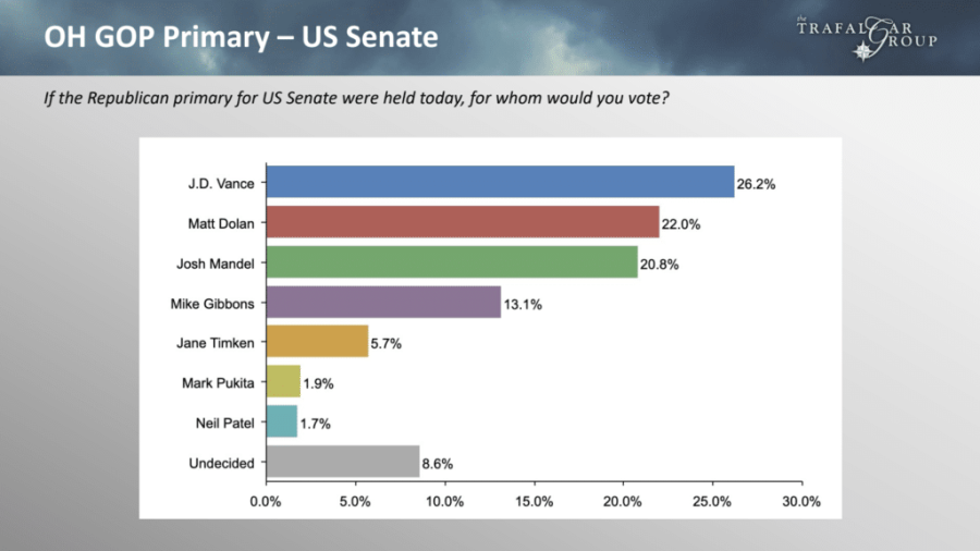 The Trafalgar poll was conducted April 29 through May 1 among 1,081 likely GOP primary voters. Its margin of error is about 3 percentage points, which mathematically puts Vance, Dolan and Mandel in contention for the lead, because each candidate’s advantage could swing by 6 points if the poll were conducted again.
